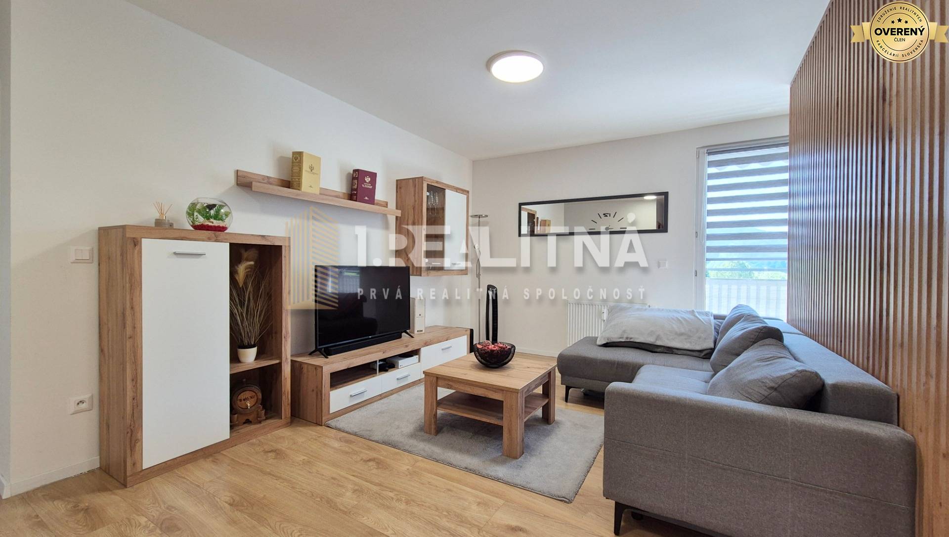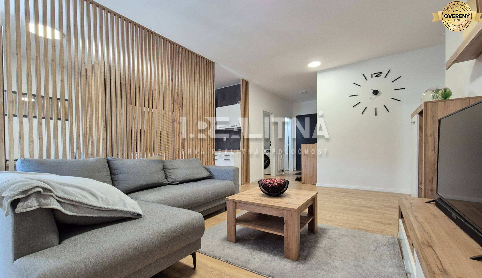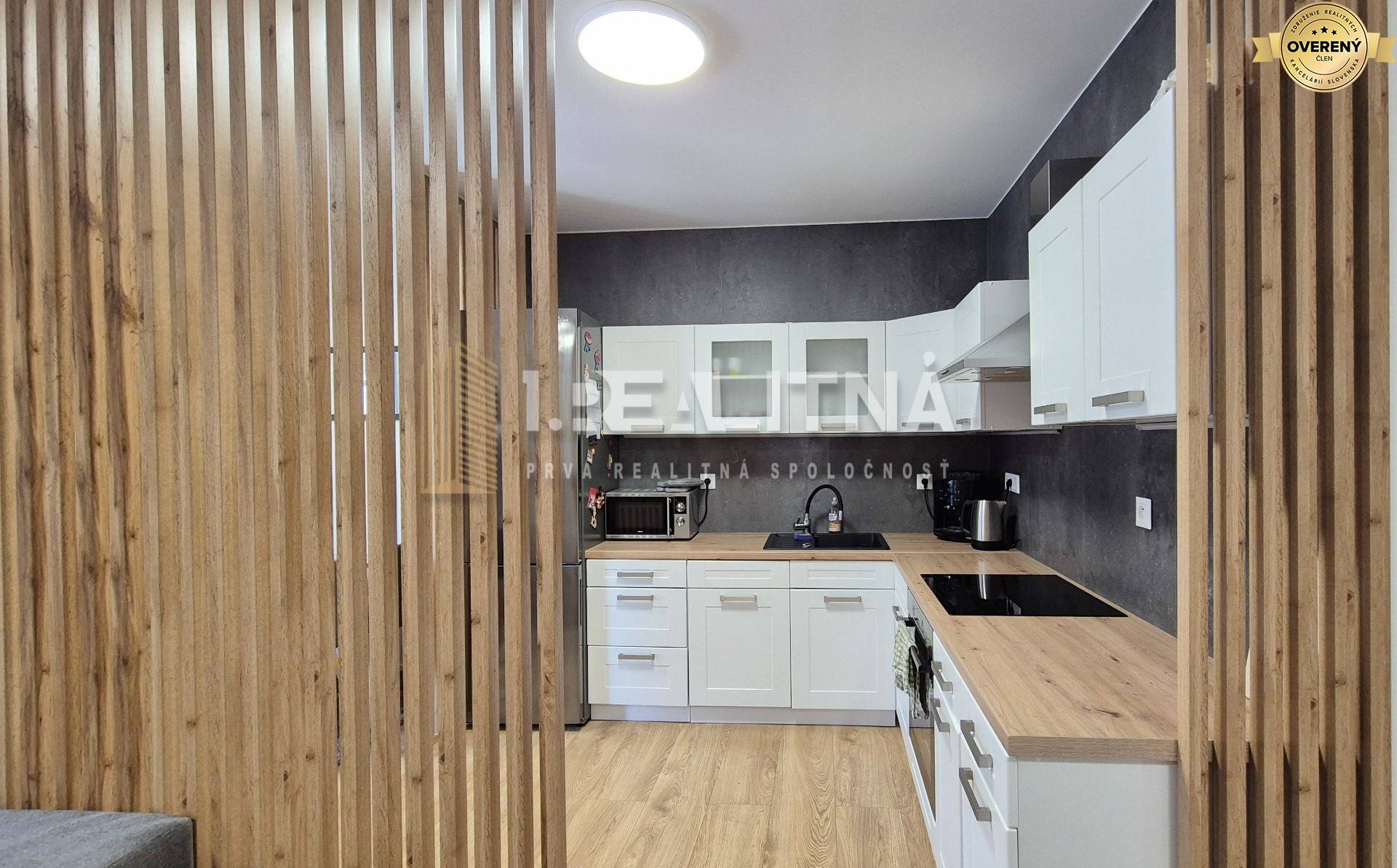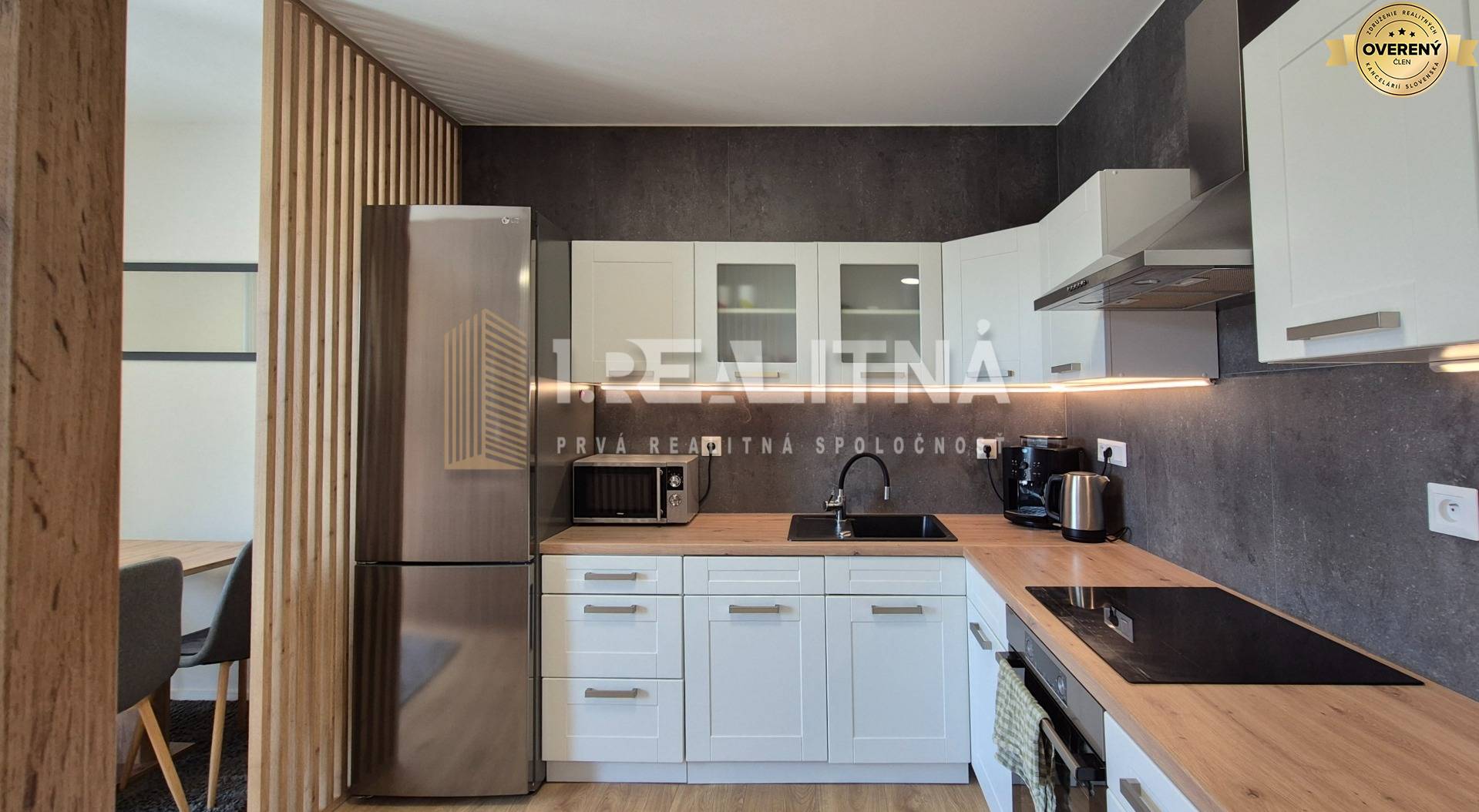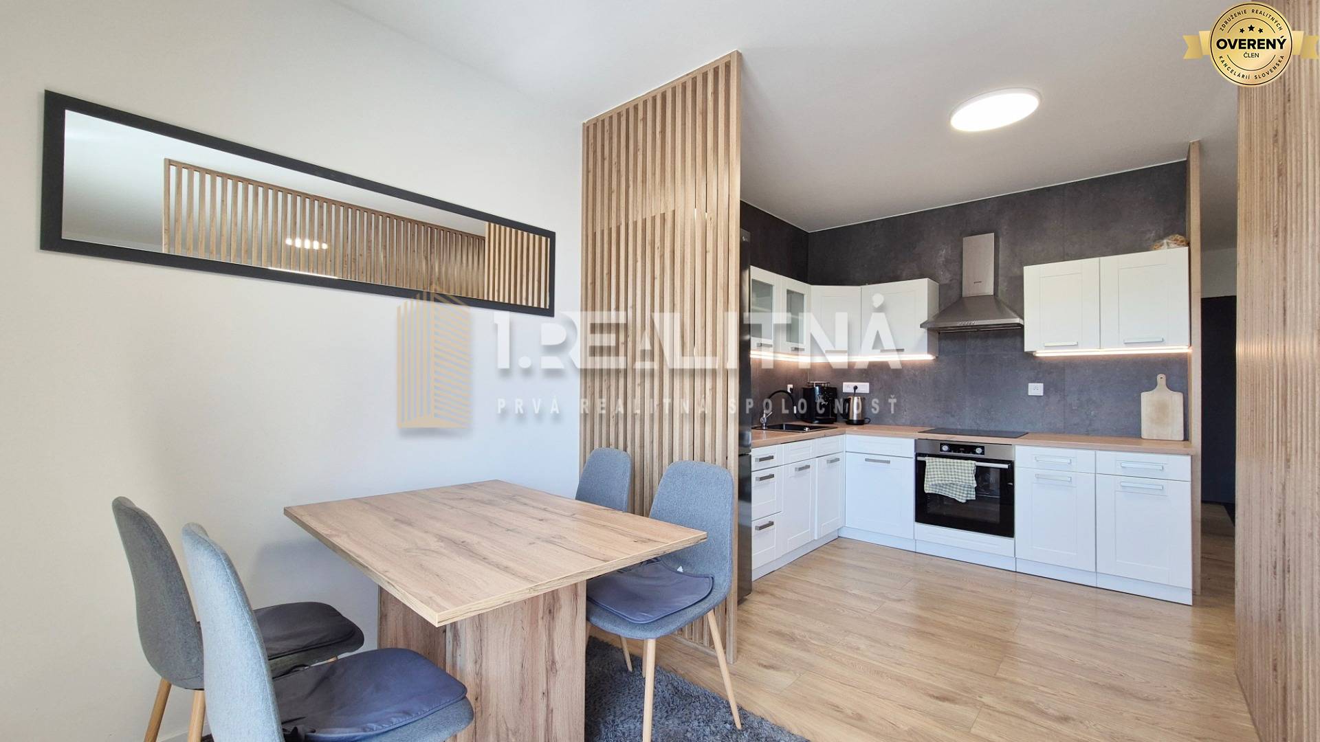 • vzdušná obývačka spojená s kuchyňou, elegantne oddelená drevenými lamelami, s jedálenským stolom a vstupom na terasu